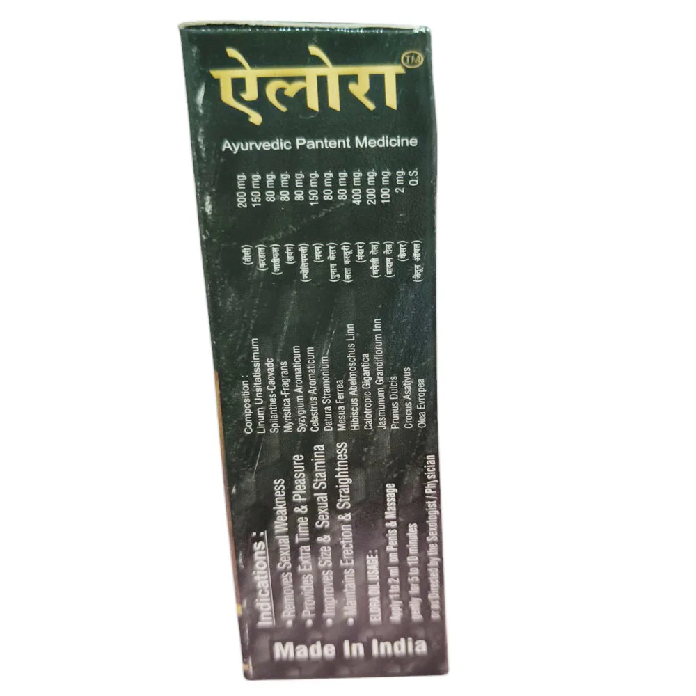 Elora Oil: The Natural Solution for Penis-Related ProblemsAre you facing issues like smallness, tightness, or timing problems in your intimate life? Don't worry, Elora Oil is here to the rescue! This specially designed ayurvedic oil is made with 100% pure herbals like Olive oil, Alsi beej, Laung, Kalonji, Jayphal, Akarkara, and more. With no side effects, this oil offers a natural solution to boost your confidence, energy, stamina, and satisfaction in the bedroom.Ingredients Details: