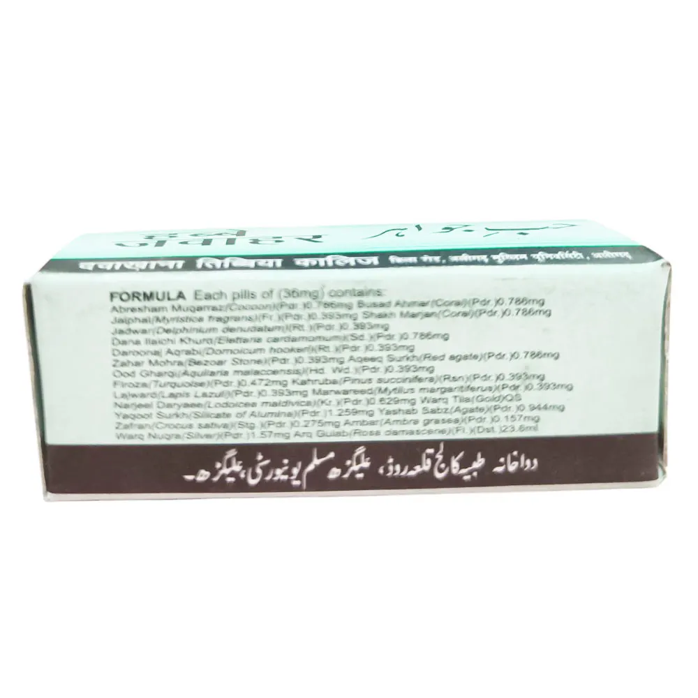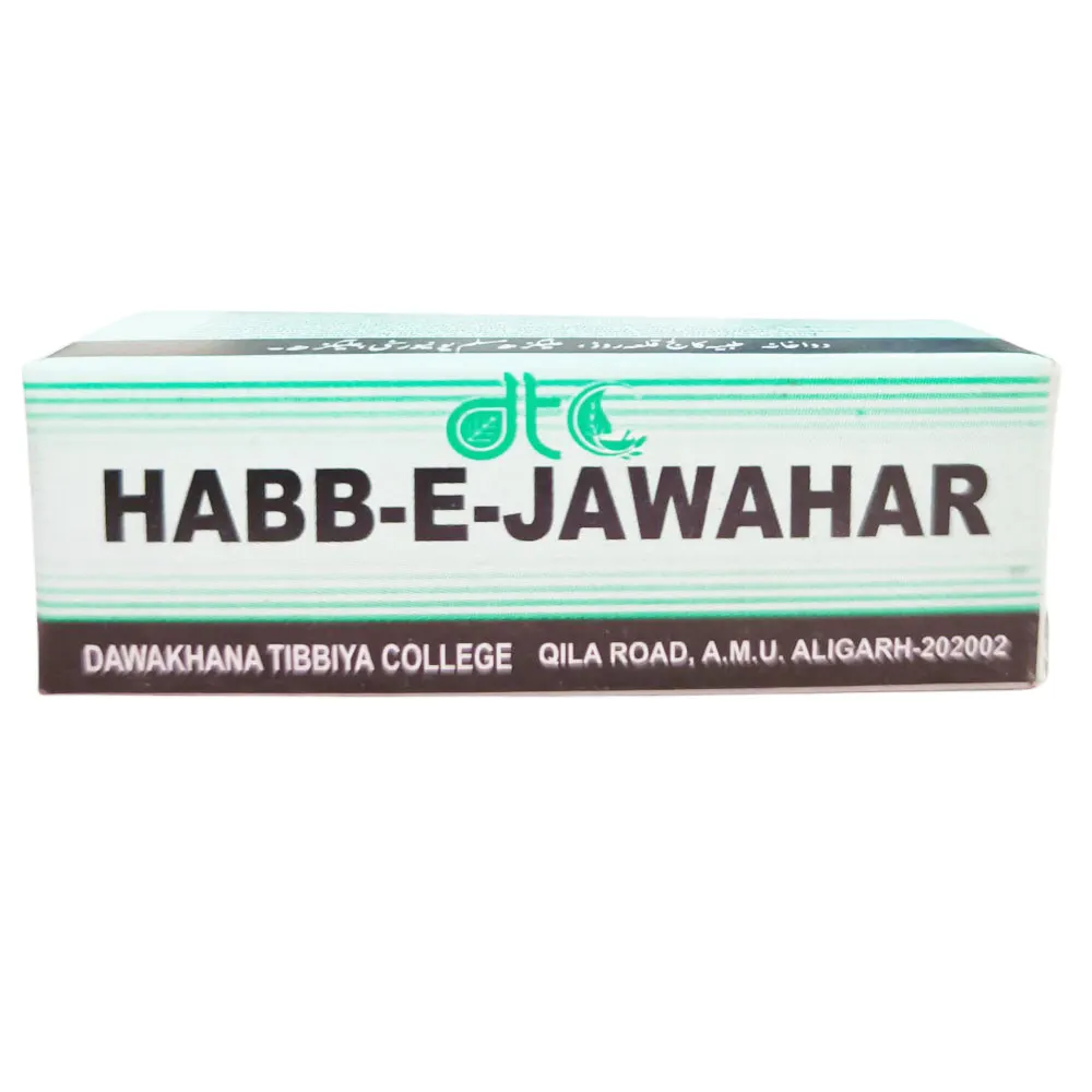 Habb–E-Jawahar acts as a Cardio-Brain tonic. It is beneficial in the post-convalescence of long-term ailments, helps men to regain vitality, and removes general debility as well as weakness of the heart, brain, and liver. This product is GMP certified and well-tried. Try it for much better results.