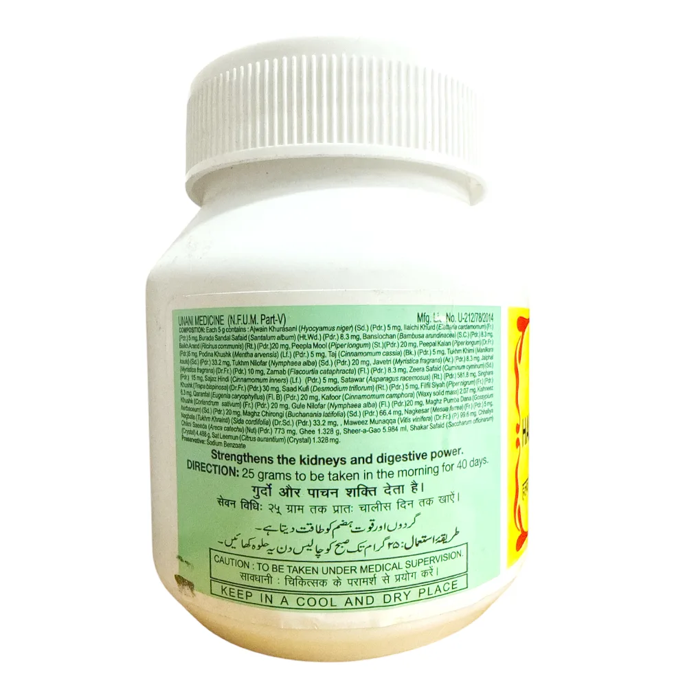 Halwa Supari Pak is an Unani tonic for both women and men, which acts on the reproductive system and helps in the management of both men’s and women’s health conditions. The main action of Halwa Supari Pak is observed on the excess secretions due to its astringent action, so it helps to treat leucorrhoea in women and spermatorrhea in men. In addition to this, it is also a nutritive tonic and provides strength to the uterus. Nowadays, it is a famous formulation used for the maintenance of women’s health.