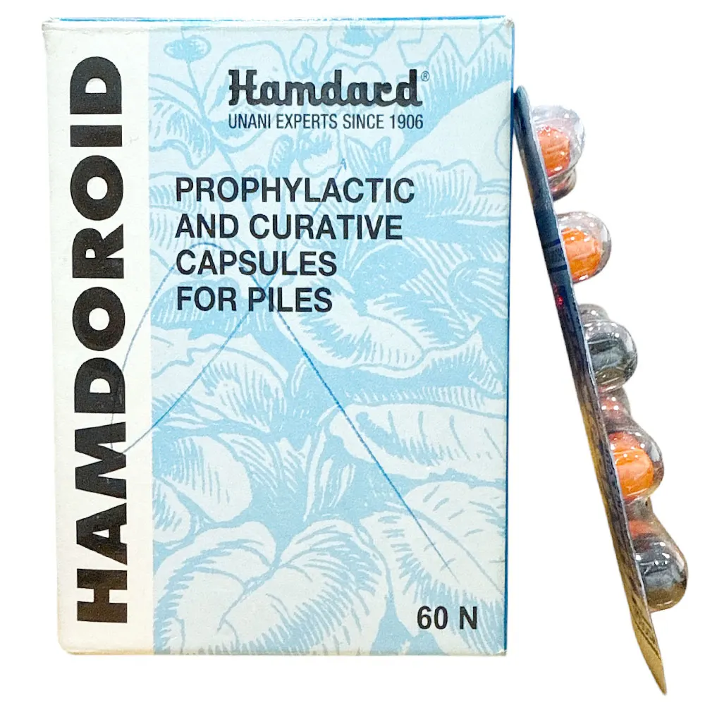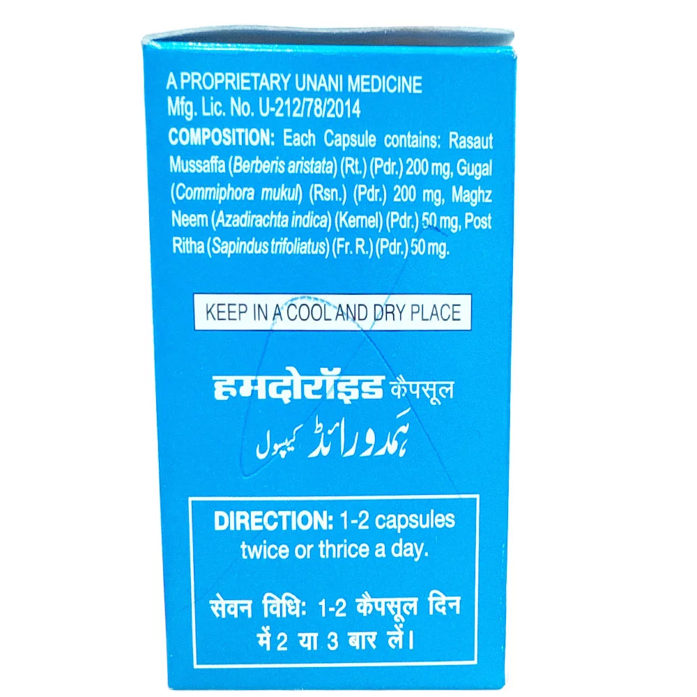 Hamdard Hamdorid Capsule is a Unani preparation. It is indicated in haemorrhoids. This Unani medicine works as a purgative and is helpful in constipation by softening stool which is a trigger factor for haemorrhoids. It gives relief in pain, inflammation, bleeding and itching.