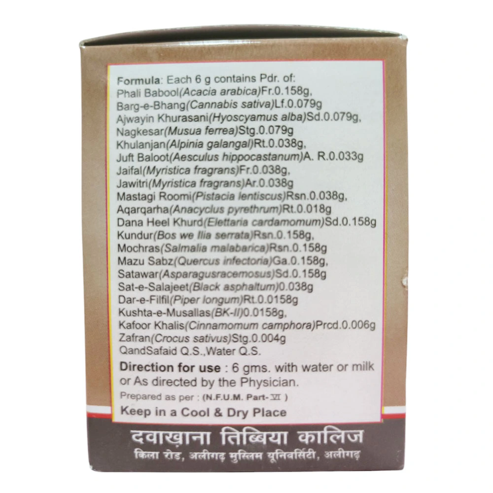 To be given 6 grams in the morning with 250 ml lukewarm milk or as directed by the Unani Physician.