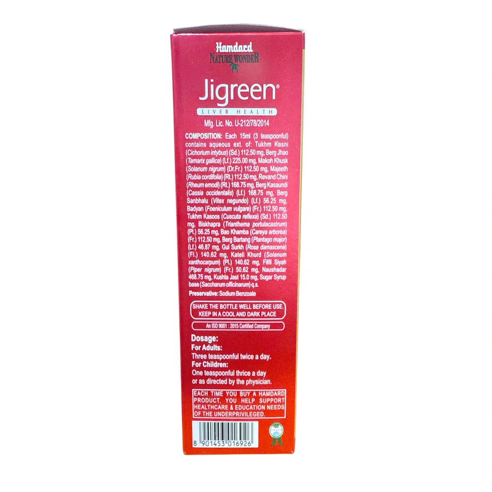Hamdard Jigreen syrup is a unique, all-natural, complex multi-herb Unani formula that helps ensure optimum liver function by virtue of its anti-hepatotoxic activity. Jigreen not only helps to protect the liver against harmful toxins from drugs, alcohol, food and water but also helps to promote appetite and digestion. Jigreen is found to be effective in the management of acute viral Hepatitis, drug-induced Hepatitis and alcoholic liver disease.
