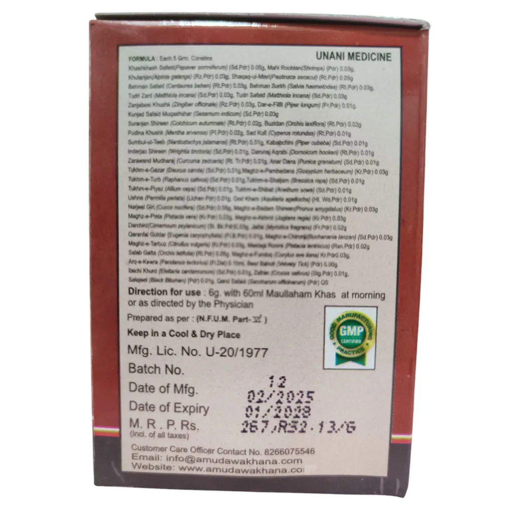 • To be given 6 grams in the morning on empty stomach with 250 ml milk or as directed by the Unani physician.
