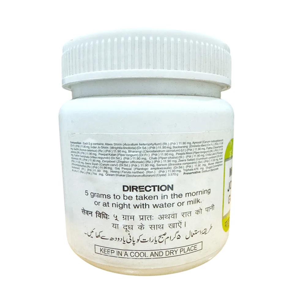 Hamdard Majun Jograj Gugol is compound drug Unani formulation. Majoon Jograj Gugal is a Guggul based Unani medicine. It is prescribed in Nervine disorders such as facial issues, issues in one side of the body, jerky involuntary movements (affectingespecially the shoulders, hips, and face), gout, sciatica, rheumatic disorders, arthritis and syphilis.