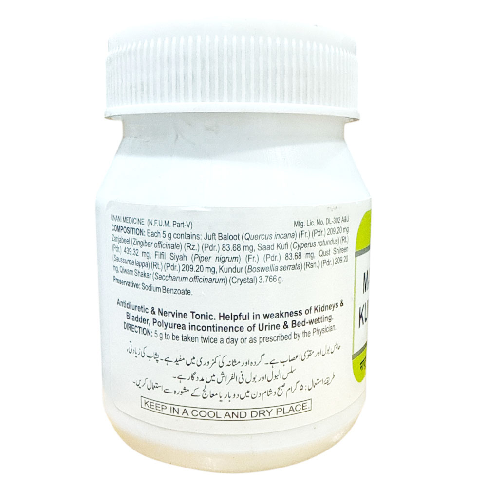 This is a Unani formulations and its name due to its chief ingredients Kundur.It is very beneficial in urinary disorders and also gives strength to urinary bladder muscles.Kundur (Oleo-gum-resin of Boswellia serrata) is used for the treatment of various ailments such as dysentery, dyspepsia, lung diseases, haemorrhoids, rheumatism, urinary disorders and corneal ulcer in Unani System of Medicine and Ayurvedic System of Medicine for the last several years.