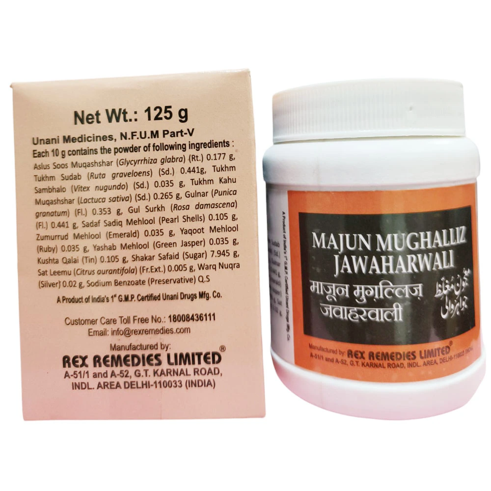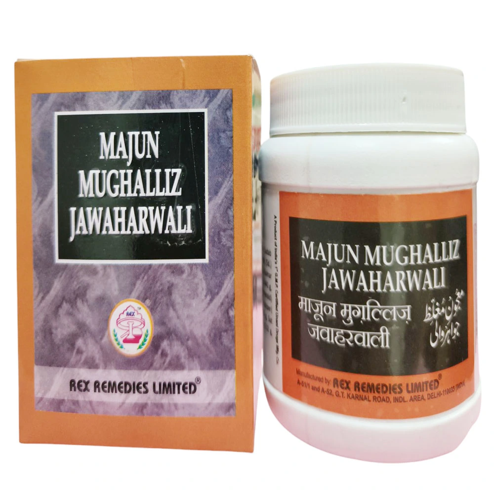 Rex Majun Mughalliz Jawahar Wali is a unique Unani preparation for male problems. It is useful in hydrospermia and also improves the quality and quantity of semen. It might improve the natural retention after removing the all problems. This is also useful in hypersensitivity of nerves.
