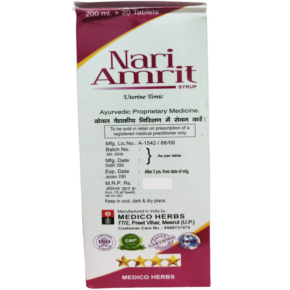 Nari Amrit Syrup is a natural herbal supplement that can help women combat a variety of internal health issues. From low stamina and anaemia to weakness, fatigue, and irregular menstruation, this synergistic blend of ingredients works together to support and balance the female reproductive system.