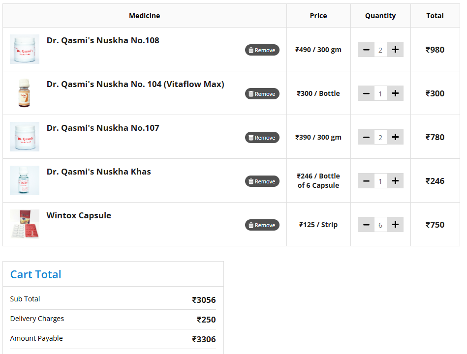 This package includes 1 boxe of Dr. Qasmi's Nuskha No. 104 and 6 strips of Wintox Capsules
