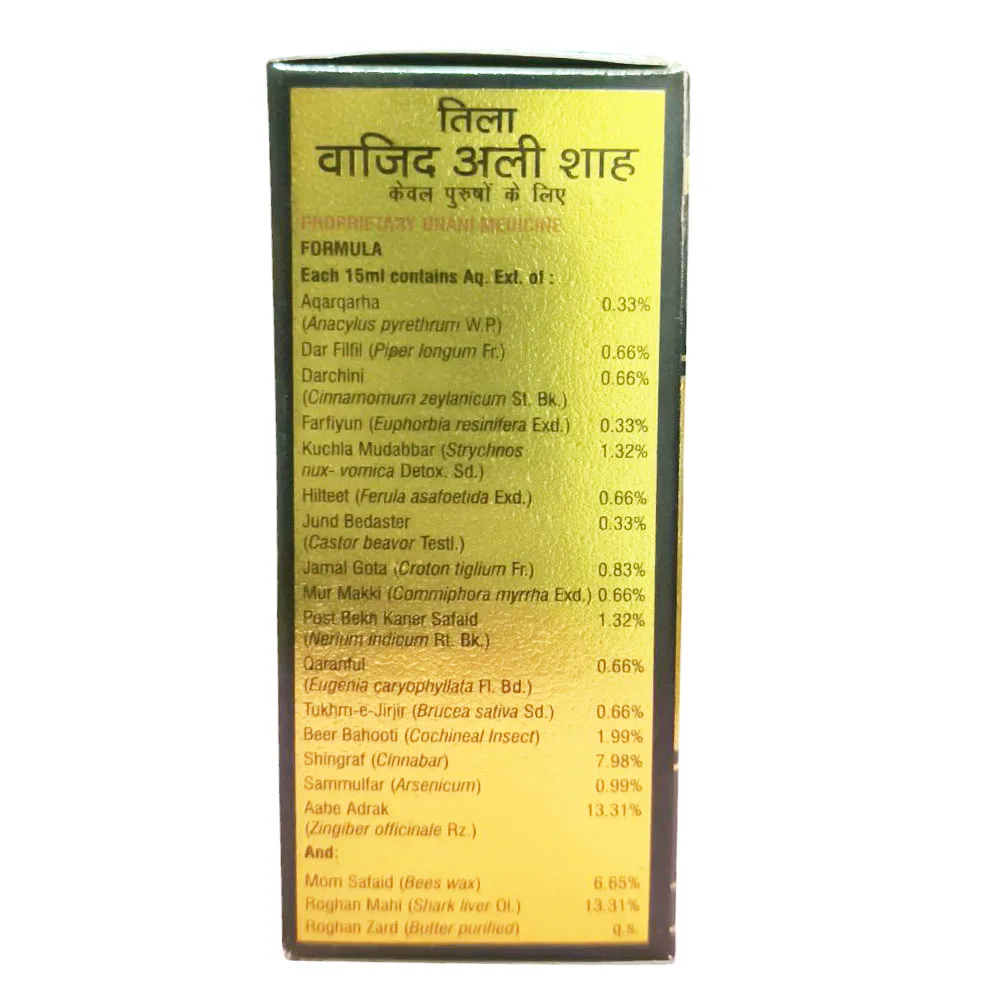 Tila Wajid Ali Sha is a very unique Unani preparation and comes in the form of oil. It addresses the issues related to male debilities. It can be very effective in erectile dysfunction and premature ejaculation. It can also enhance the blood circulation in males.