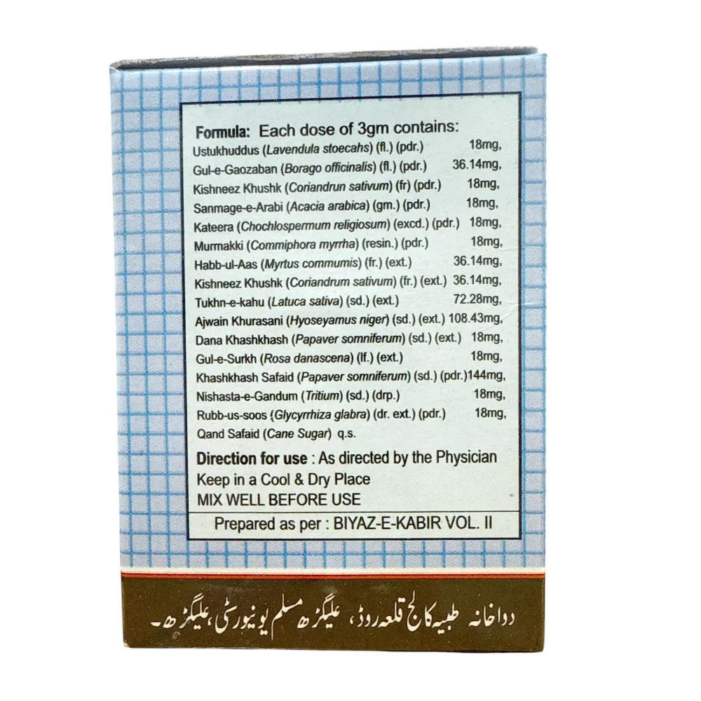 This is Unani compound drugs combination.It is used for chronic respiratory diseases and chronic cough.It is also beneficial in sinusitis.